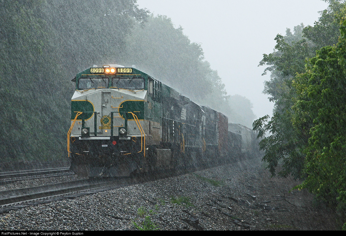 | The Southern heritage unit idles in the pouring rain at south Roddy, waiting for two northbounds before 197 will continue its journey south. |