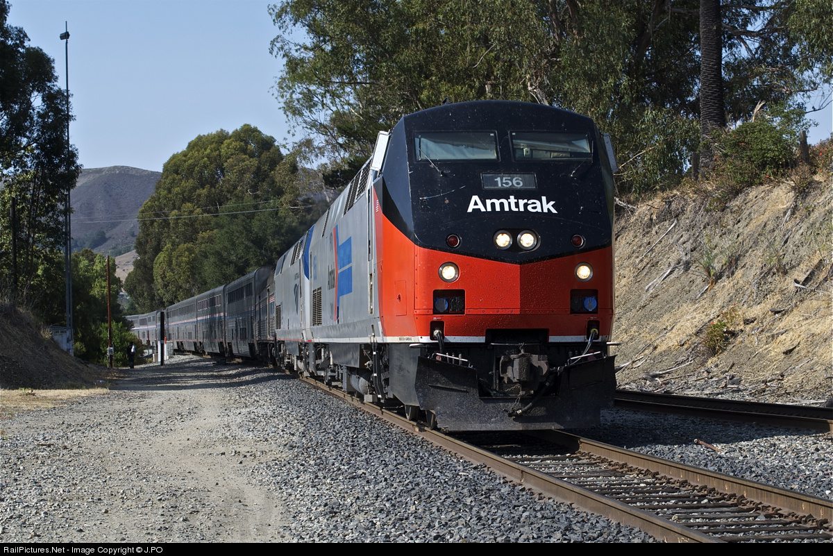 | Heritage unit 156, sporting Amtraks "phase I" paint approches San Luis Obispo to meet the northbound starlight before continuing it's trip to LAUPT. The bloody nose almost gives this train an Espee appearance from a distance. |