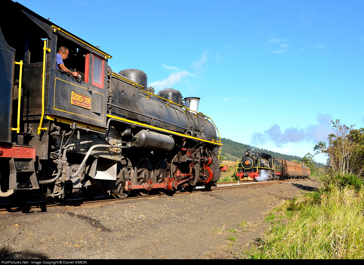 The Mikado 153-1M is returning to Tubarao with a loaded coal train. The 205-7M is waiting in the yard with an empty train for the Alco to clear the line. A Bernd SEiler charter.