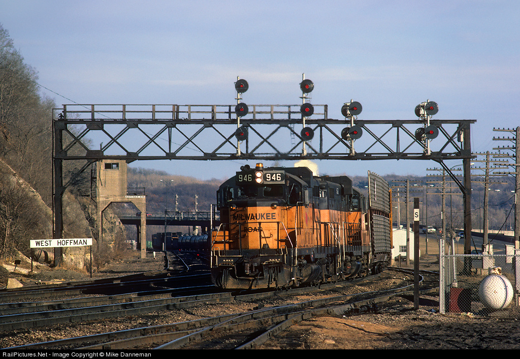 Two Milwaukee Road GP20s take a westbound freight through Hoffman Avenue in St. Paul, Minnesota, on the afternoon of March 22, 1986. With not much room in the area between the multiple tracks below Dayton’s Bluff, Hoffman Avenue tower was built of concrete and located on a structure over one of the tracks. Now abandoned, the tower can be seen in the background, along with the now missing track below. I’d imagine the passing of trains just below your feet was quite the sensation for an operator. Milwaukee Road GP20s were not true EMD-built GP20s, but were GP9s rebuilt and upgraded to 2,000 h.p. locomotives by the road’s own shops.