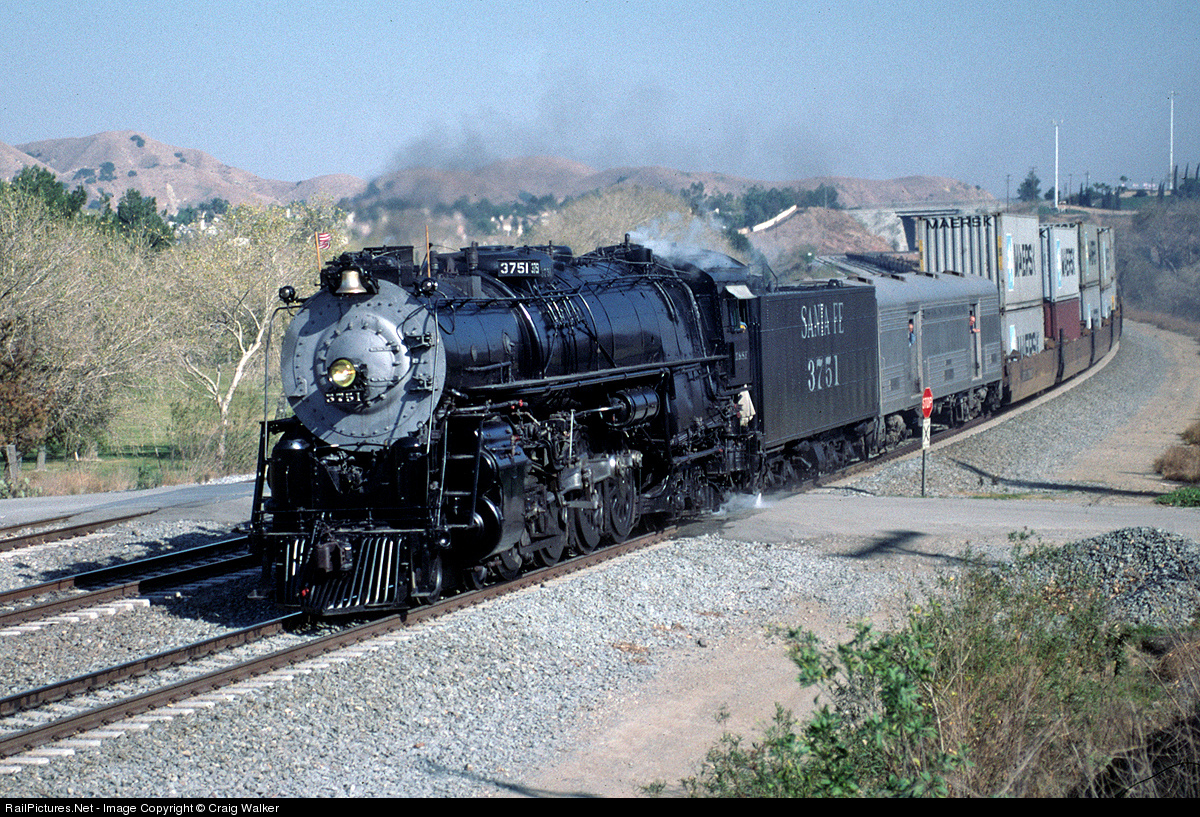 Santa Fe 4-8-4 3751 blasts through the Green River Golf Course, just west of Prado Dam, between Corona and Yorba Linda, California, on train O-SBDLAC1-12. The locomotive was moving from its old home in San Bernardino to its new home in Los Angeles, and hauled a short freight en route - primarily for the braking capabilities.