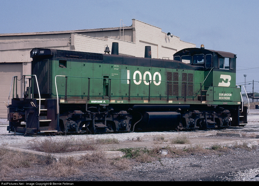 Burlington Northern MP15DC #1000 sits on the Shop Lead. #1000 was built March 1975 as Frisco (SLSF) #361. Unit later became BN #4000 and later Burlington Northern Santa Fe #3700