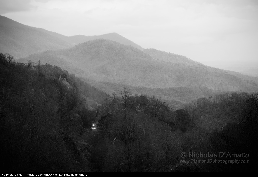 | The lights of a yet-unseen train cut through the landscape of bare trees, their leaves already fallen for the winter, as daylight wanes on this dreary November day in the Blue Ridge Mountains. |