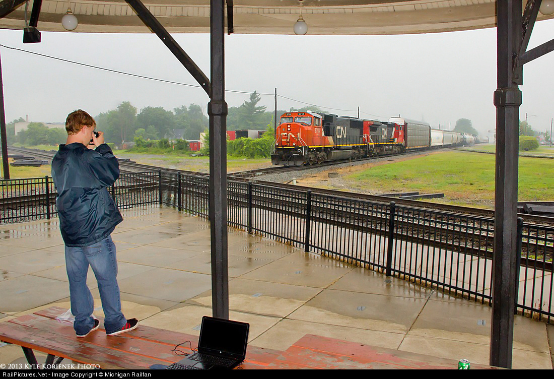 | Under cool and rainy skies, CN L502 backs into the yard in Durand as fellow railfan Evan Locke gets his shots of the backing move. |