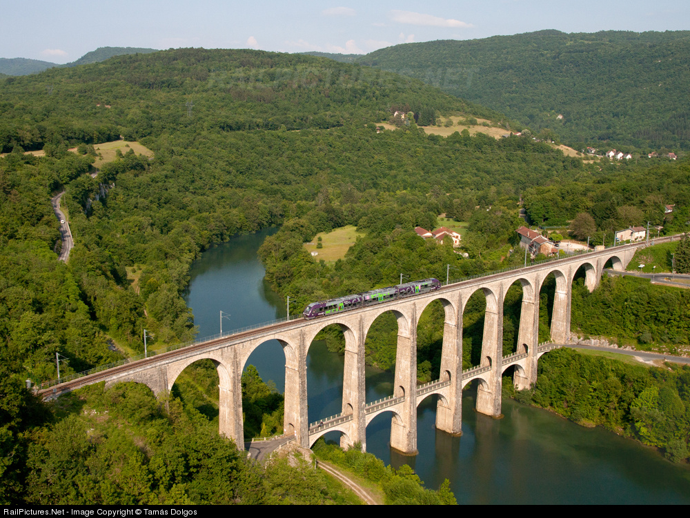 | SNCF B 81661 is passing near Cize-Bolozon in a spectacular scene on the Cize-Bolozon viaduct which is a road-rail bridge crossing the Ain gorge in France.