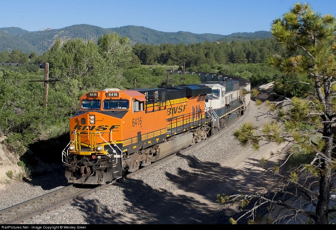 On a nice summer morning, a southbound BNSF coal load bound for the Fayette Power Project in Halstead, TX, rolls downgrade through the curves north of Monument. Powering the train were BNSF 6416 and 9508 on the point, with BNSF 6237 and 9273 on the rear.
