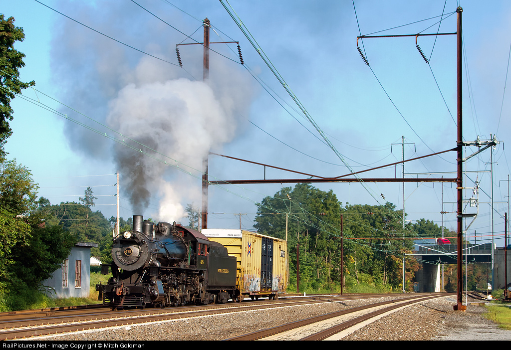 Strasburg Rail Road's 4-8-0 #475, former N&W, grabs a revenue load left by Norfolk Southern at Leaman Place Junction. As is typical (yes, typical!), the crew will couple to a loaded passenger car with paying patrons brought up earlier and bring the mixed train back to the yard in Ronks, PA.