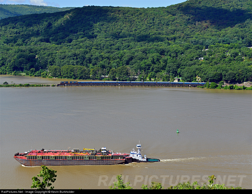 Having just made it to this location with roughly 30 seconds to spare, I was quite surprised to see the barge and tug boat that would be temporarily "pacing" the CSXT P952-04 as the train rolled onto Iona Island. Timing was everything for this shot and emphasized how much EZ Pass does really 'save time'! Long story short for this photo - I had traveled from Kingston to Bear Mountain with knowledge of train travel time vs. highway time from the August 2 northbound run. Everything went well and was anticipating at least a 3-5 minute leaway for setup. Unfortunately I had forgotten the EZ Pass in the SUV (back in White River Jct.). When I arrived at the Bear Mtn. Bridge toll booth, there was a line of approximately 4 motorcycles and 8 cars. The EZ Pass Lane had a nice flow of traffic (pout). As the line of traffic painstakingly moved forward, the P95204 called the signal just to the north of the bridge. Panic time... Quickly handed the toll taker the correct change and shot out of the gate. An expeditious trip across the bridge and turn up the hill for the pulloff was made and as I jumped from the truck, the train's headend was just pulling under the bridge - just enough time to shoot up river (other shot I posted) and then run up the wall a bit to get this shot. It would be the final shot that I would take along the river of this train, but one well fought to achieve. Next time I'll bring the EZ Pass for sure!