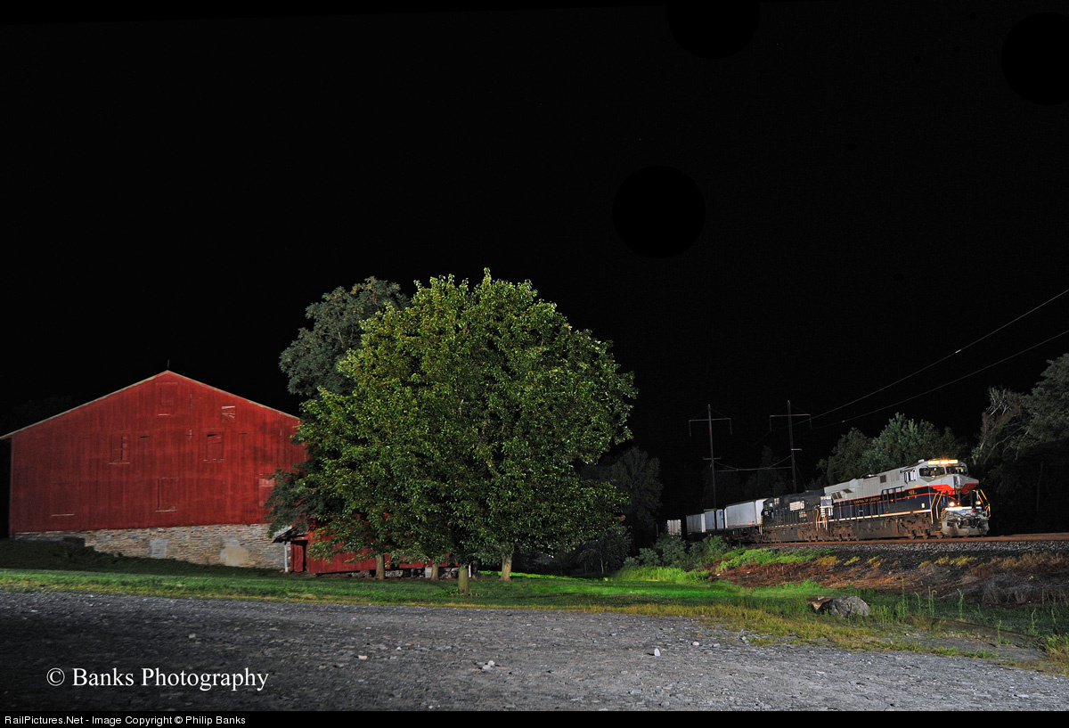 On a double Heritage Unit night, the NS 8025 on 64R and the NS 8101 on the 23W were traveling the Port Road on the same night it opposite directions. Here NS 8101 (Central of Georgia Heritage) is passing one of the barns of Lancaster County in Columbia, Pa.