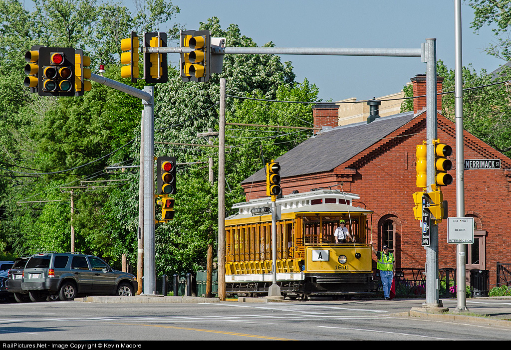 Trolley Traffic Lights? In an effort to prevent collisions between the National Park Service Trolley Fleet and the motoring public, the City of Lowell Massachusetts has begun experimenting with a series of traffic lights for trolleys. One such set is located at the busy Merrimack Street crossing shown here. The new lights are most obvious in this photo just above and to the left of Car 1601. It used to be that trolley crews had to stop and watch the regular traffic lights, then attempt to time their crossing of Merrimack Street when the the traffic light for the cars was red. The new light system is fully integrated with the regular traffic lights. It displays a horizontal white bar when the trolley must hold short of the crossing for auto traffic. When the regular traffic lights stop the flow of auto traffic, the trolley lights display a vertical white bar. In this photo, Motorman Amy and her Flagger Jay observe the horizontal bar, waiting their turn to continue their trip to the National Park Service Visitor Center.