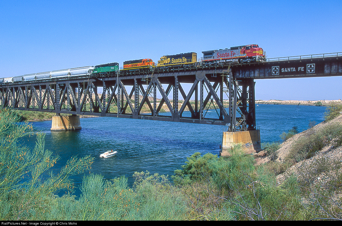 | A sampling of BNSF paint schemes cross over the Colorado River into Arizona. Leading is a Santa Fe Warbonnet ,followed by a Santa Fe yellow bonnet, BNSF Heritage One and a Cascade Green. |