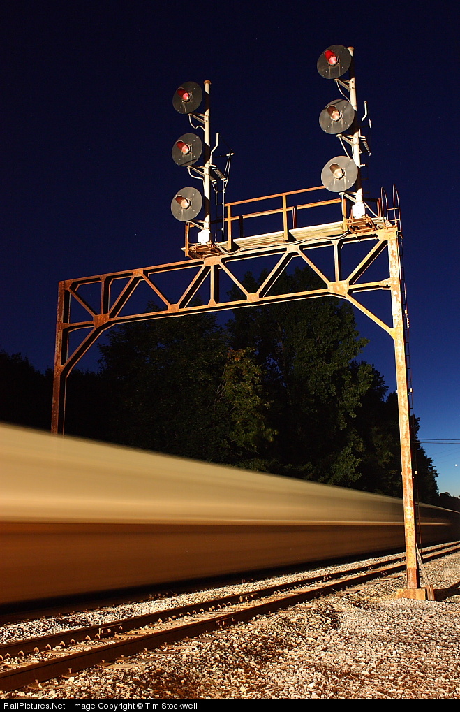 The old Boston and Maine signal bridge at CPF448 in Eagle Bridge, NY protects eastbound ST Train 206 against westbound ST Train 23K, as the headlights from 23K illuminate the signal bridge and 206, which is nothing but a blur of intermodals in this long exposure.
