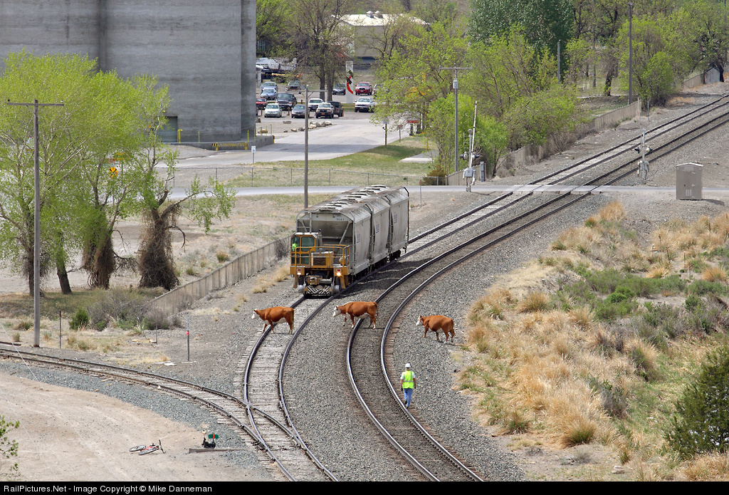 A Trackmobile from Holcim Trident Cement sets out three covered hoppers for the Montana Rail Link at Trident, Montana, on May 16, 2013. A worker from Holcim has ridden his bike down from the plant to help with lining switches, and as it happened on this day, to herd three free-ranging cattle off the tracks too!