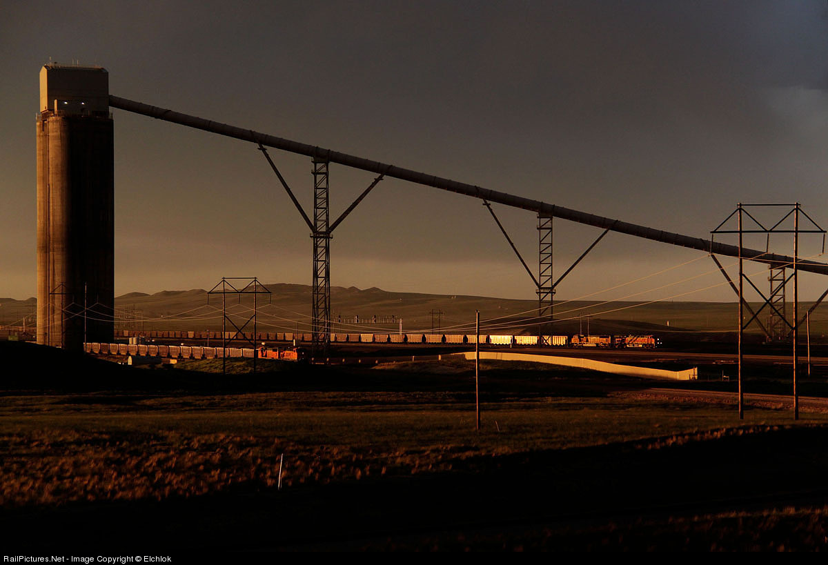 Another coal train makes its way to the mine as the last light of the day glints off its side. An angry thunderstorm is already approaching for the night..