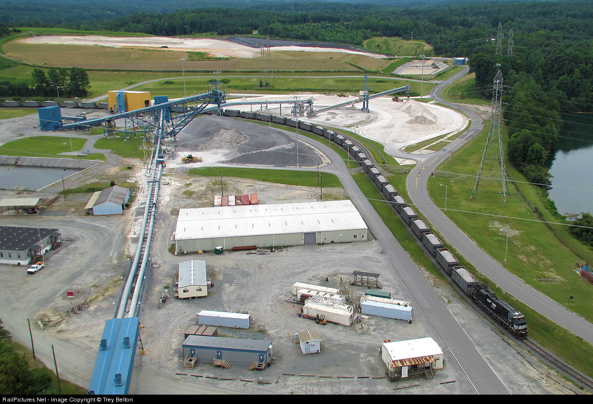 The NS 8135 backs the last cut of limestone from the 68R into the East Yard at Belews Creek Steam Station. This is used in the plant WFGD or "scrubber" system and is injected into the flue gas to help reduce Sulfur Dioxide, the key ingredient in Acid Rain. The byproduct from this process is synthetic Gypsum, which is sold to produce wallboard or Sheetrock as it is better known. The Gypsum can be seen on the white pile in the back ground. It is loaded onto trucks and taken to a wallboard plant near Mount Holly, NC