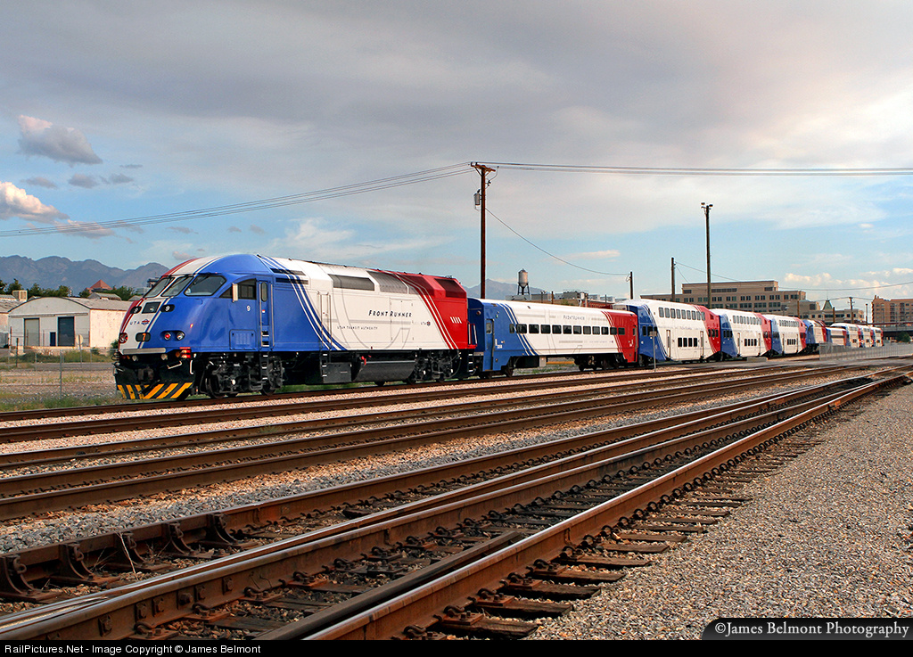 A pair of UTA FrontRunner commutes roll through Salt Lake City approaching North Temple station. The second train set experienced a mechanical failure in Layton, and is being dragged back to Warm Springs yard for repairs.