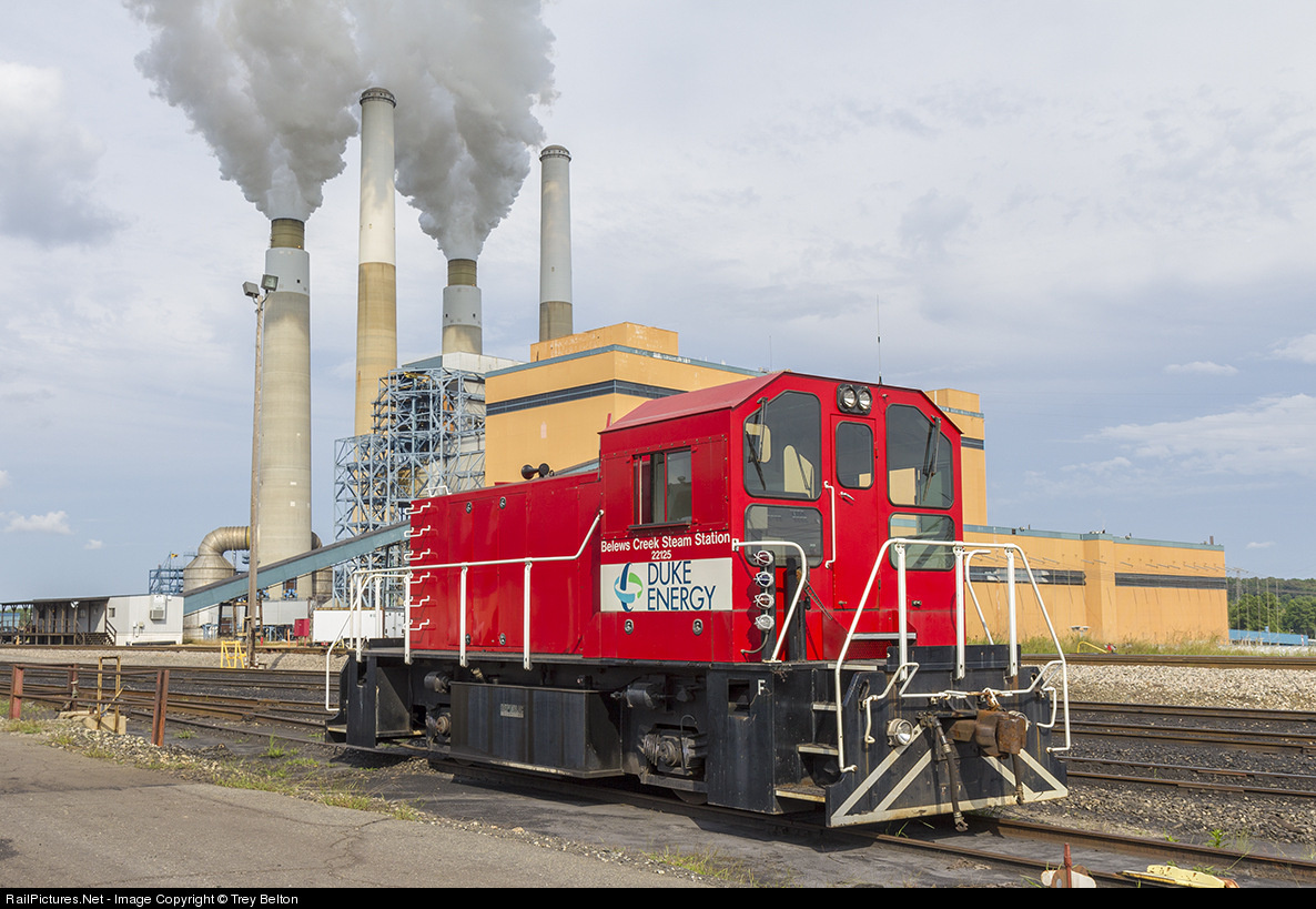 The Republic Locomotive Works yard switcher waits for the next Norfolk Southern train to bring another load of coal to Belews Creek Steam Station. The station burns two 105 train loads per day and produces 2400 MW. The taller stacks are a little over 600 feet in height. The WFGD "Scrubber" stacks are 450 feet in height. The plume seen is largely made up of water vapor.