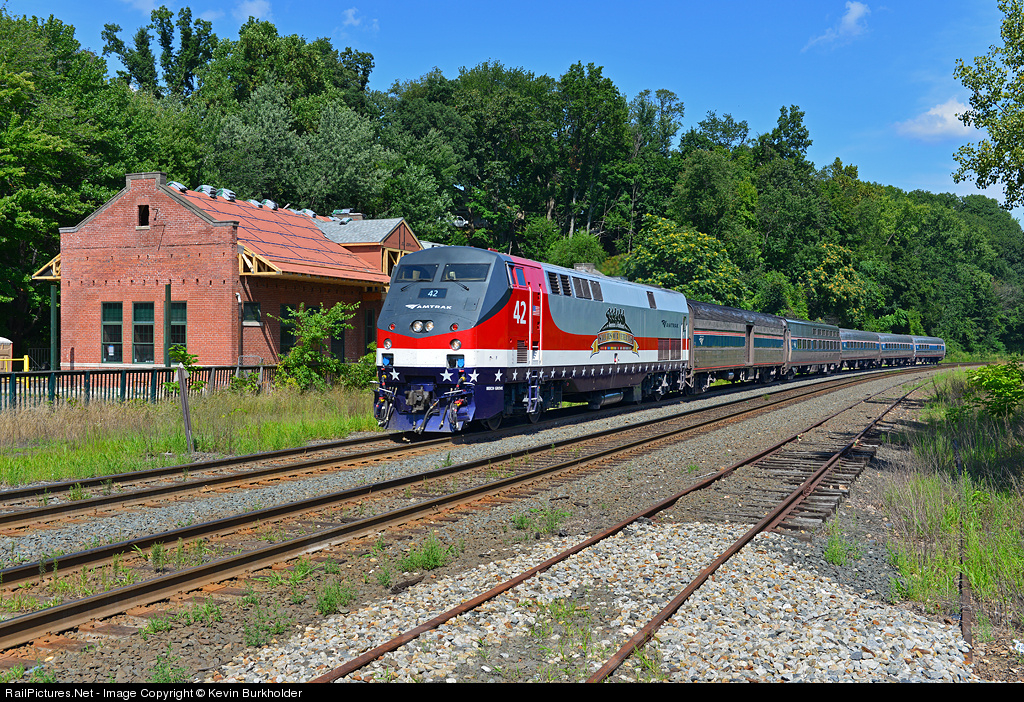 | Amtrak's "Honoring Our Veterans" P42 #42 leads the Amtrak Lake Shore train #449-17 westbound on CSXT through West Springfield, Massachusetts on a gorgeous August 17 Saturday afternoon. |