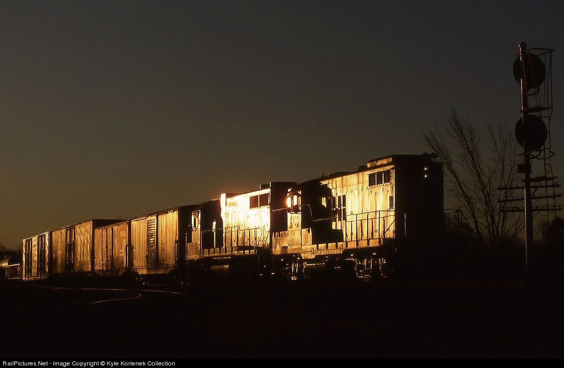 | One of the best done special effects shot on film I have ever seen, the strong rising sun glints off of the side of a pair of GP18's as they race westbound through Durand with a freight. 35mm slide from my collection, photo by Steven Kindschy. |