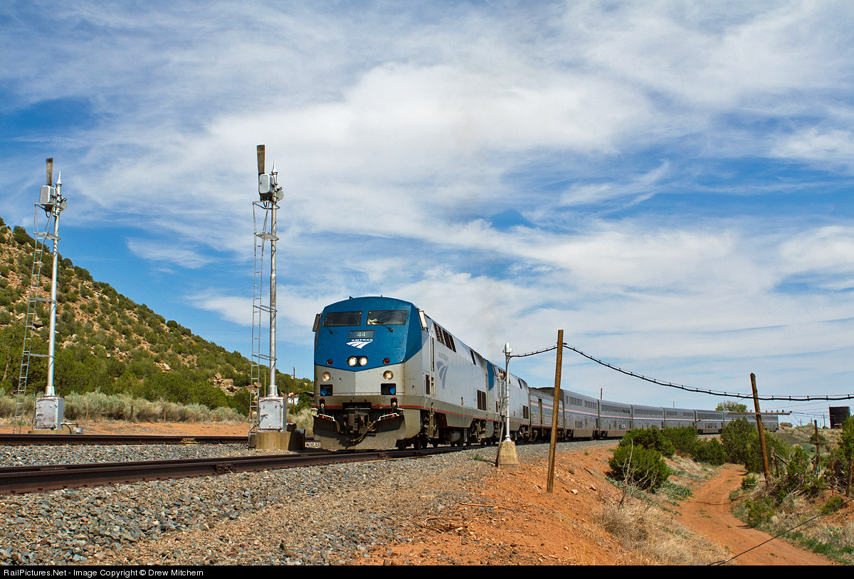 Amtrak train #3 is about to take the clear signal out of the west end of the semaphore protected siding of Chapelle after meeting train #4 here on 7/23/13. Chapelle has semaphores still protecting both ends of the siding here, in 2013 none the less! Also of note, the lead unit here, Amtrak 44, had its nose damaged pretty good after recently hitting an auto carrier fowling a crossing in Albuquerque, NM.