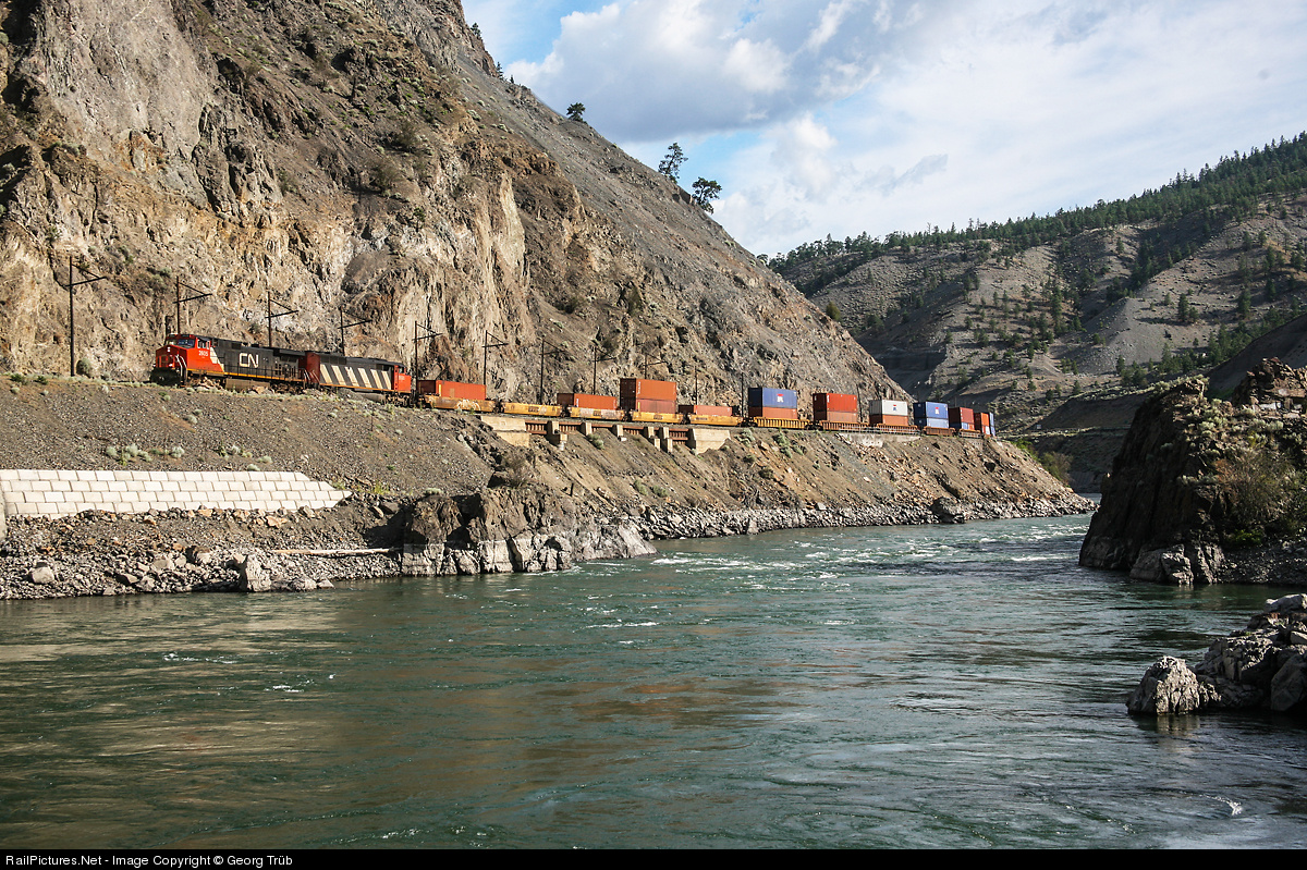 C44-9W # 2605 and SD60F # 5530 of CN are pulling a doublestack container train down the Thompson River gorge near the Frog Rapids.