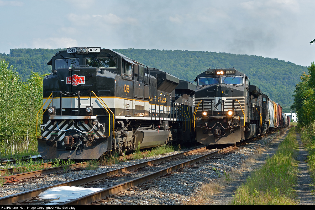 The S&A 1065 sits quietly in the "yard" at Sayre, PA as the H12 local led by NS 9403 departs for Elmira, NY. The 1065 was supposed to be the leader for the departing H12, since it trailed on the inbound H12, but the crew swapped power with the H13 and the 1065 will now sit quietly until H13 is called the next day.