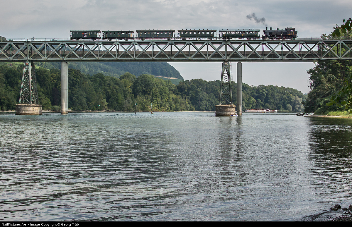 Former Bodensee-Toggenburg steamlocomotive Eb 3/5 # 9, a powerfull 2-6-2 T built by Maffei/Munich in 1910, with a charter passenger train of DVZO on the Rhine bridge between Hemishofen and Etzwilen. This 13,3 km long SBB line from Singen/Germany to Etzwilen was never electrified and is now owned by Stiftungen Museumsbahn Stein am Rhein – Etzwilen – Hemishofen – Ramsen & Rielasingen – Singen (SEHR & RS), and operated by Verein zur Erhaltung der Eisenbahnlinie Etzwilen-Singen (VES). The 254 meter long and 25 meter high Rhine bridge was built in 1875. In the background the motor vessel "Schaffhausen" (largest of the fleet, built in 1970 by Bodan Werft Kressbronn) of the company Untersee und Rhein, which is on the way from Schaffhouse to Kreuzlingen as sailing # 543, a beautiful river and lake journey of nearly 5 hours.