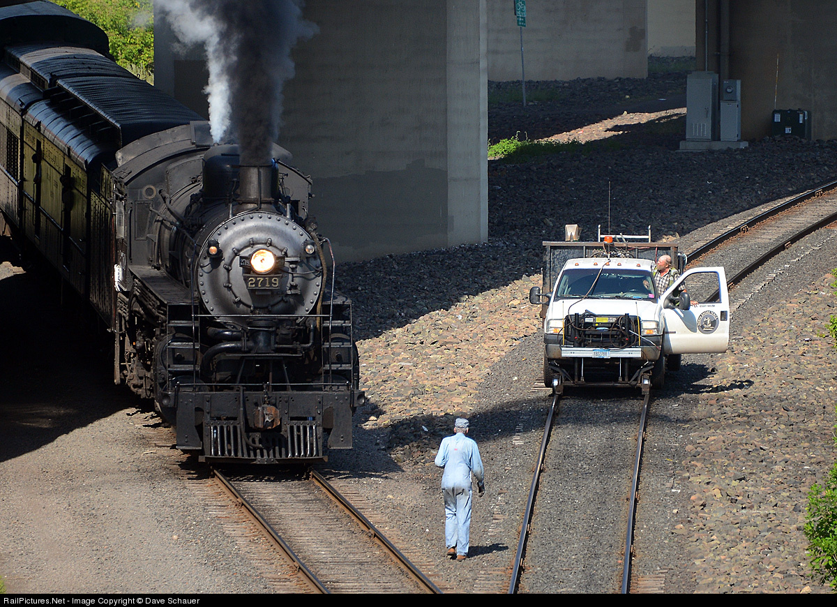 | Soo 2719 backs its train into Duluth Union Depot after a successful run to Two Harbors and back. Given drought conditions in the Duluth area a hi-rail fire patrol followed the train and has stopped in the clear. |