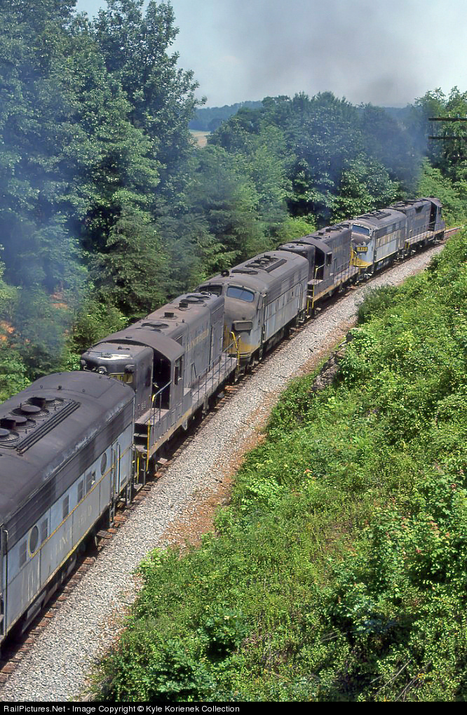 A six pack of first generation geeps power a heavy southbound coal train towards Kingsport, Tennessee. At this time, this was certainly a rarity, especially considering the railroad had SD40's, SD45-2's, and U36C's to haul big coal trains such as this. 35mm slide from my collection, photo by Keith Ardinger.