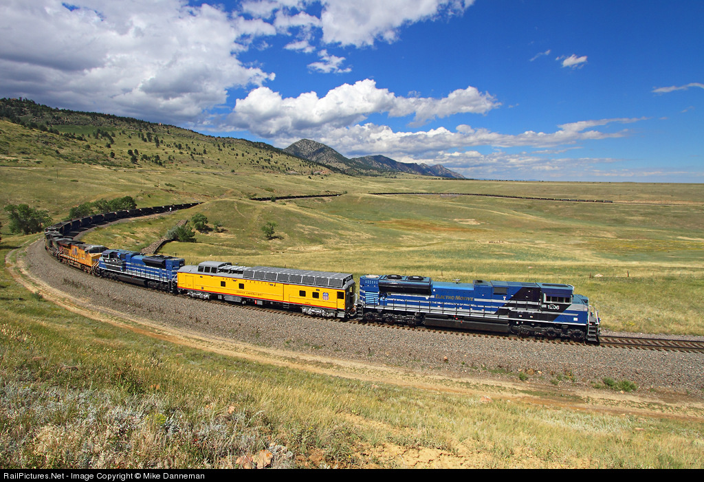 Union Pacific is testing Electro-Motive Diesel’s SD70ACes on the Moffat Tunnel Subdivision west of Denver, Colorado. UP’s mobile laboratory car No. UPP 210 is bracketed by EMD demonstrators Nos. 1206 and 1208 on high-adhesion tests with a westbound West Elk Mine coal empty leaving Rocky and about to enter Big 10 Curve on August 26, 2013.