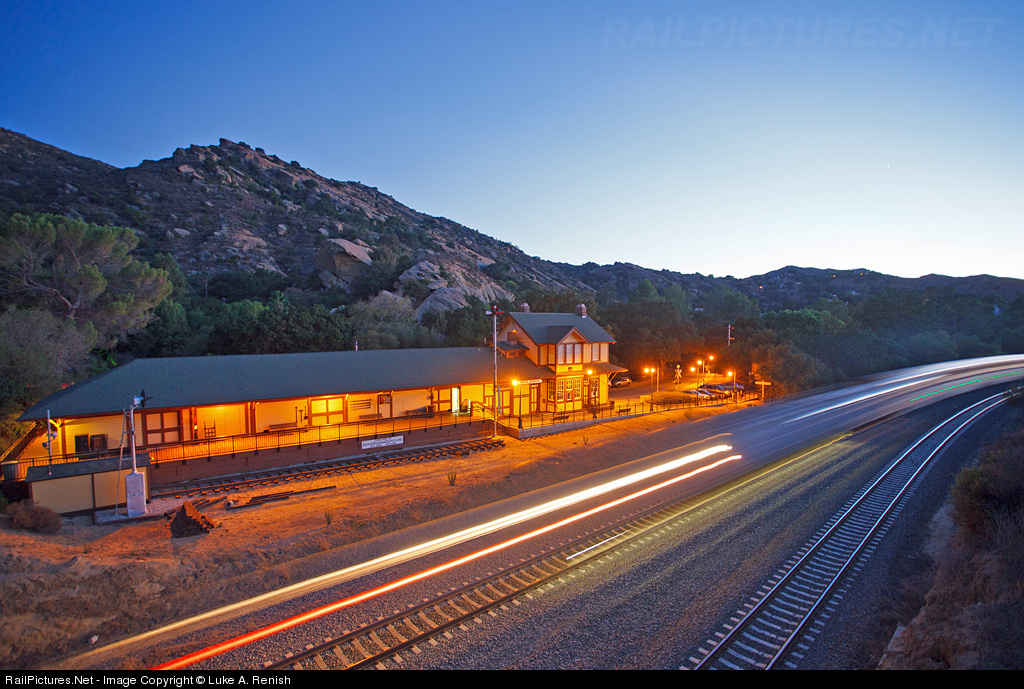Amtrak 156 leads the Coast Starlight past the picturesque Santa Susana depot as the sun sets on a hot August day.