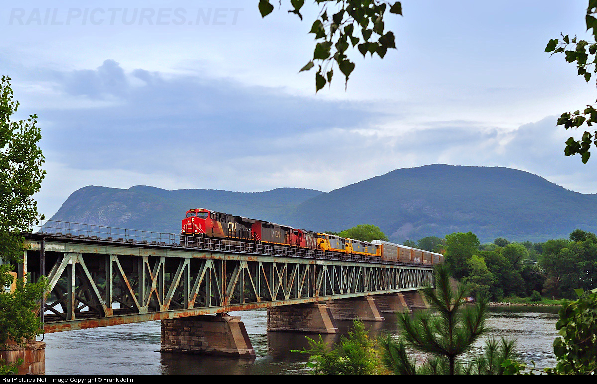 Canadian National #401 with three three ex-QNSL Dash 8-40CM’s sold to The Andersons, rumbles across the Richelieu River at Beloeil on a warm and humid August day.