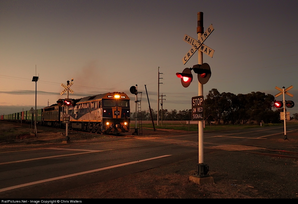 CFCLA-owned G512 and Steamrail's S313 combine to haul No.9072 southbound Sunrice train across the Cobb Highway Barnes in south-western New South Wales.
