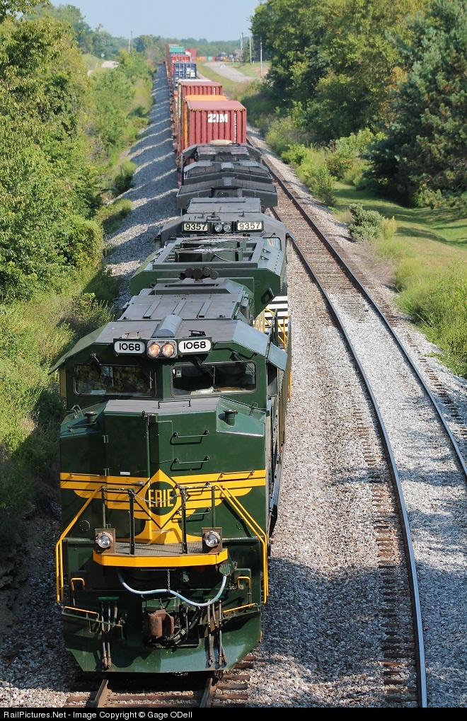 Erie 1068 leads NS 22A as it slowly rolls past 2 eastbounds at Waddy as it follows NS 29W westward toward Louisville