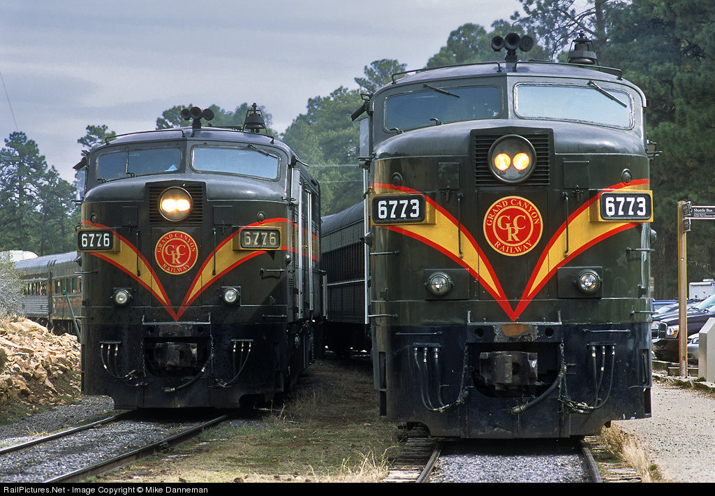 Two Grand Canyon Railway passenger trains fill the tracks at the South Rim on March 17, 2005. Both trains are led by A-B sets Montreal Locomotive Works (Alco design) FPA-4s.