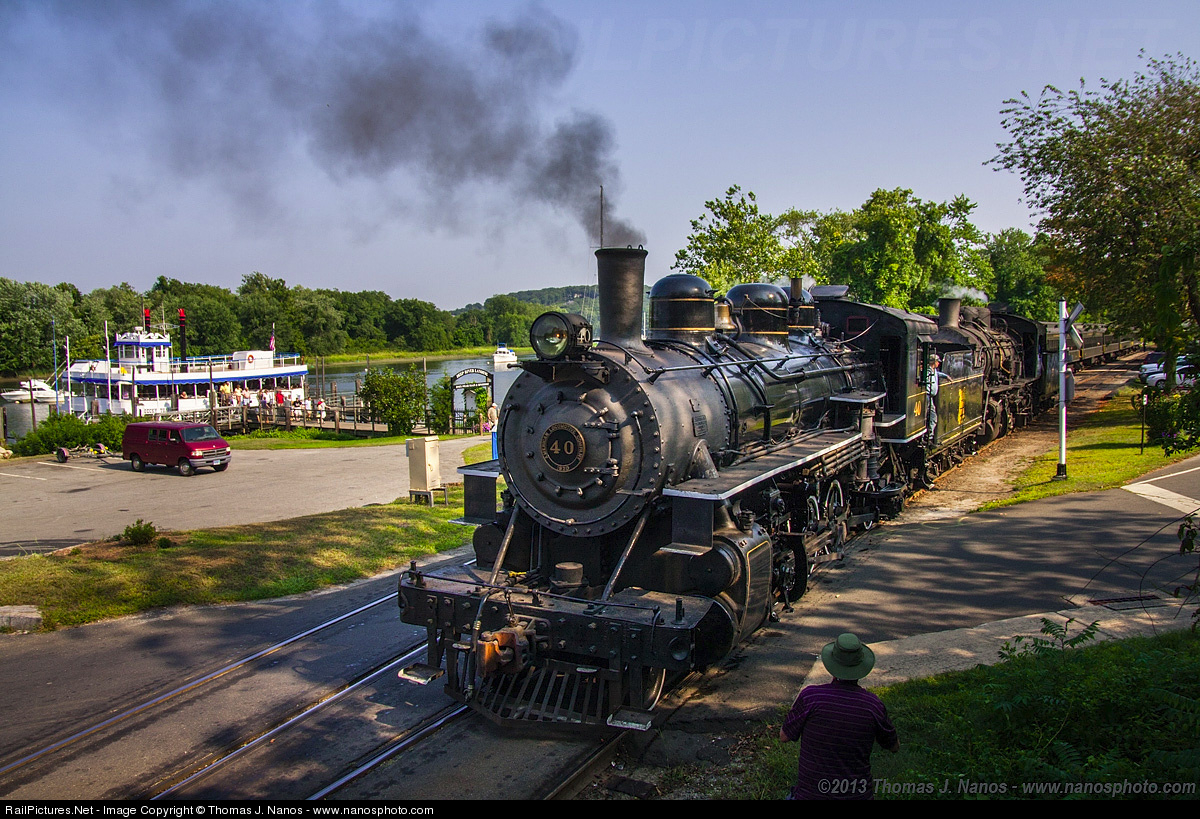 Mikado Double Header - Valley Railroad 2-8-2s No 40 and 3025 team up to power two trains on the afternoon of August 21, 2013. Pictured here is the final run of the day. The shop forces recently finished work on 40s running gear, and wanted to do some full-scale tests to make sure all was well. Since these tests were being conducted on revenue runs, 3025 was also placed in the consist as an insurance policy in the event anything went awry with 40. Nothing went wrong during the tests, and 40 was put into service the following day. Also visible in the background is the Becky Thatcher - the "riverboat" portion of the Essex Steam Train and Riverboat.