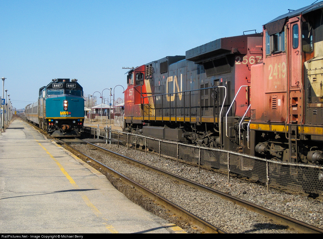 VIA 6407 pulls into Dorval to make its station stop and is about to pass a stopped CN westbound that had just got a new crew (not a very common occurrence). The CN westbound is powered by CN 2567, CN 2419 and CN 2515 (the last out of sight) For more train photos, check out http://www.railpictures.net/photos/mtlwestrailfan/