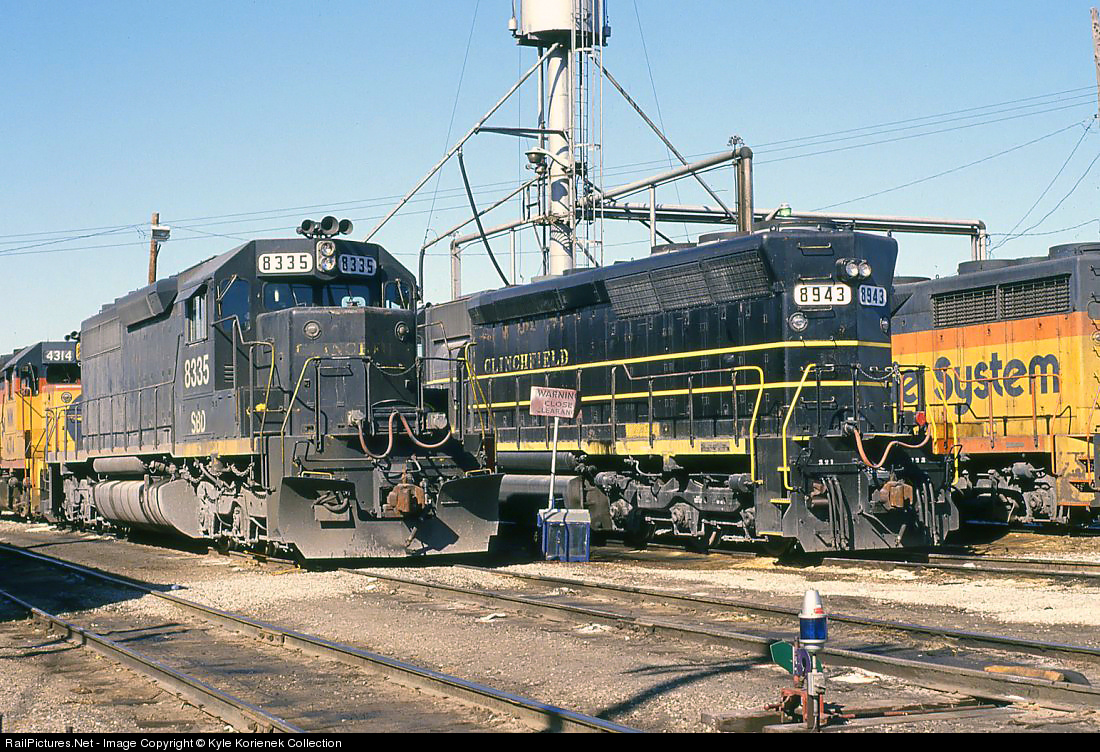 To better serve customers, the creation of CSX corporation was decided to be the best option between Seaboard System and Chesapeake and Ohio. As a result, locations such as the former C&O engine terminal in Saginaw, MI. would have some unusual power on site. This is evident as a pair of former Clinchfield units sit in the terminal, both unpainted bearing only new number boards and the SBD reporting mark. 35mm slide from my collection, photo by Jack Smith.