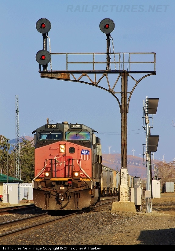 | Union Pacific (Patched Southern Pacific) AC4400CW #6400 leads a grain train down the Tehachapi Pass towards Bakersfield, CA. This was the last engine painted in SP colors to lead a train under the SP Signal bridges because about a week later, they were taken out of service. |