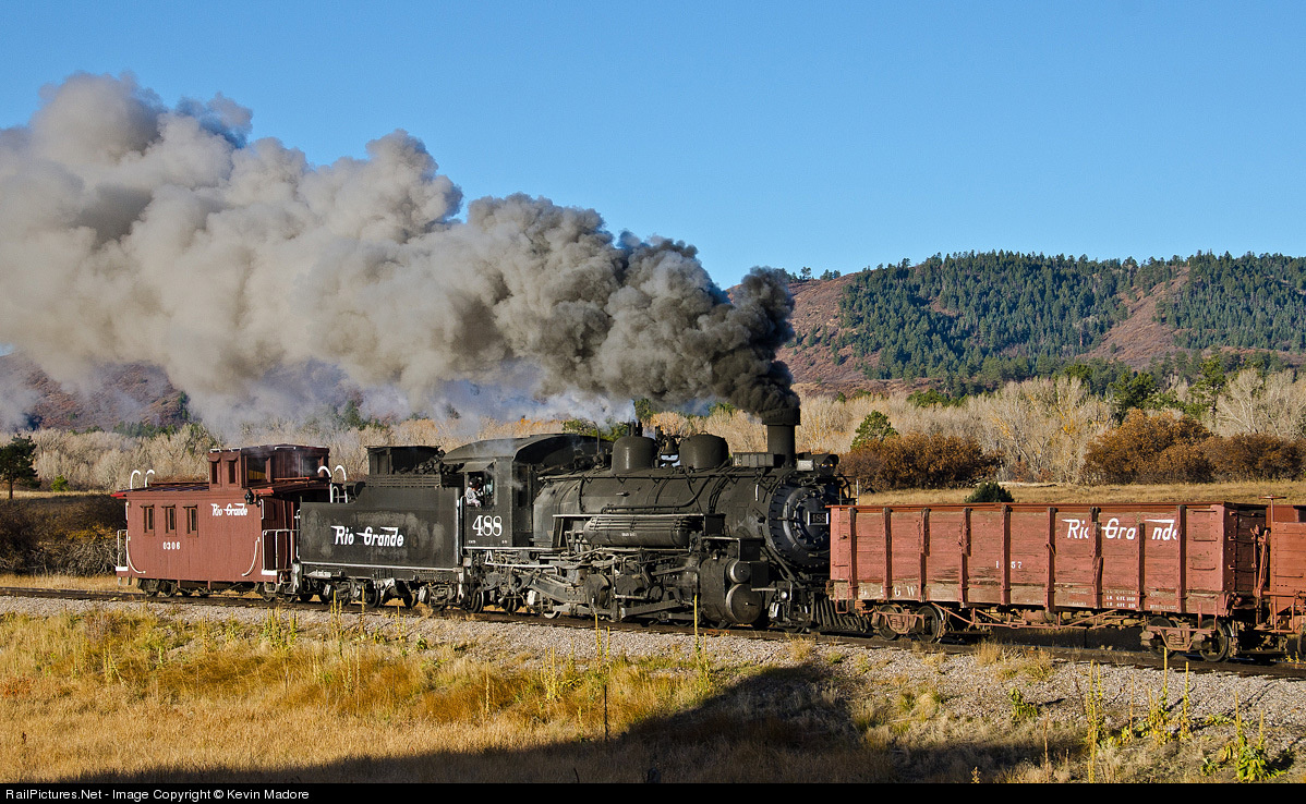 Pushin' Hard! Just a half a mile or so from the beginning of the daunting 4% grade, we find K-36 #488 pushing hard on the tail end of a Rio Grande Freight headed for the 10,000 ft. high Cumbres Pass. Newbies to the narrow gauge often wonder why the railroad spread the locomotives throughout the consist rather than double or triple-head in in a conventional way. The simple answer is that the Lobato and Cascade Trestles on the two approaches to Cumbres Pass were both built back in the 1880s, when locomotives generally weighed a heck of a lot less than the roughly 90 tons of a basic K-36 without tender. As a result these bridges were no longer safe to handle multiple locomotives once the K-series came along. Rather than going through the time-consuming exercise of stopping the train and running one or more locomotives light across the bridges....then recoupling on the other side....the railroad elected to simply spread them out in the consist, so there was never more than one on the bridge at any given time. It was therefore very common to find a road engine on the point, a mid-train helper, and a tail-end pusher, like the 488 seen here. Of course, all trains would typically end with one of the Rio Grande's distinctive wooden cabooses.
