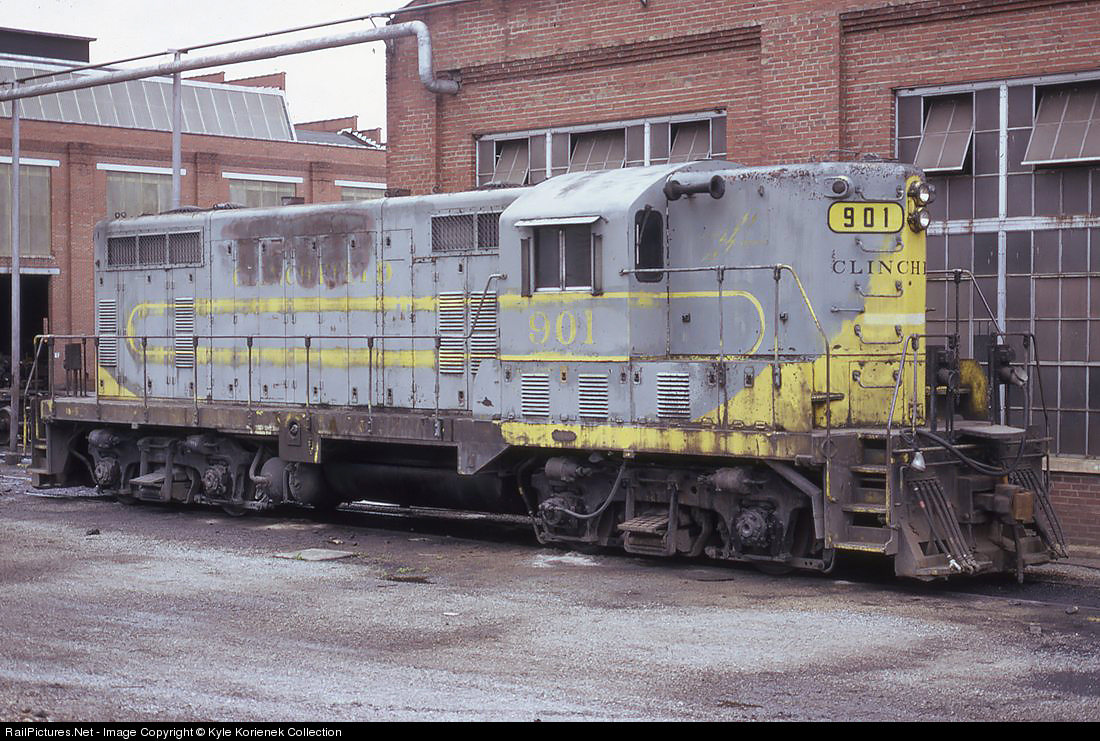 Clinchfield GP7 901 sits outside the Erwin shops, awaiting its next duty. The unit was in the first batch of GP7's that the railroad purchased in 1950, the GP7's never met expectations mainly due to the lack of Dynamic brakes, which was a mistake the railroad did not make again. The unit was rebuilt into a GP11 by ICG and renumbered to 4603. 35mm slide from my collection, photo by Ken Marsh.