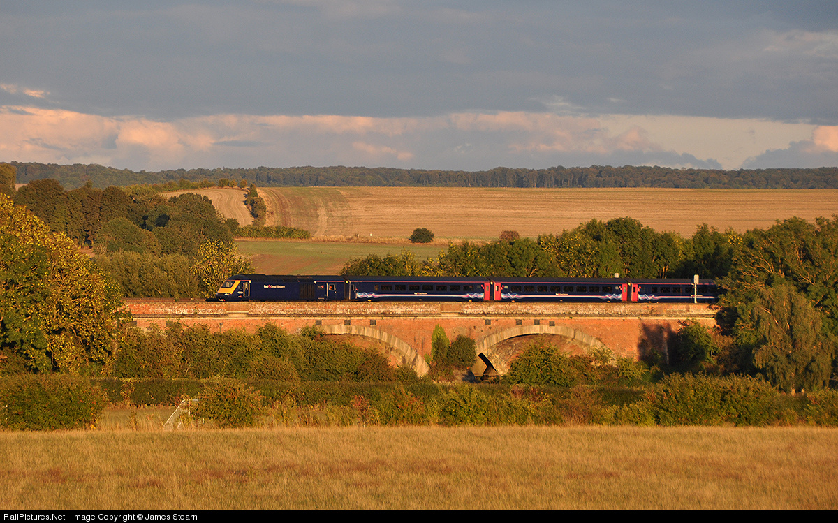 | With a stormy backdrop 43009 'First Transforming Travel' is lit by the setting sun as it leads a First Great Western Intercity 125 across Moulsford Bridge. The bridge, designed by Brunel structure crosses the Great Western Mainline over the River Thames in south Oxfordshire. |
