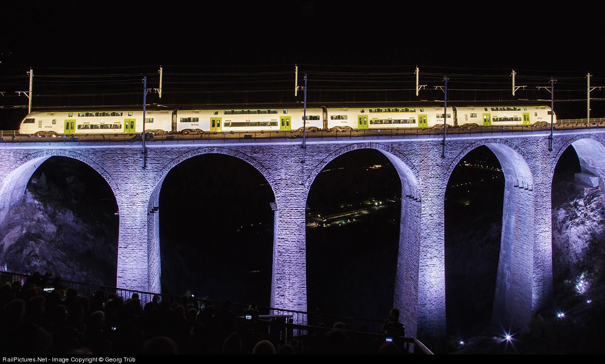 | The new doubledeck commuter trainset RABe 515 "Mutz" for the first time on the Luogelkin viaduct during the night vehicles parade for the 100 years celebration of the Lötschberg line. From profile reasons the train is not allowed to run over the mountain line without restrictions. |