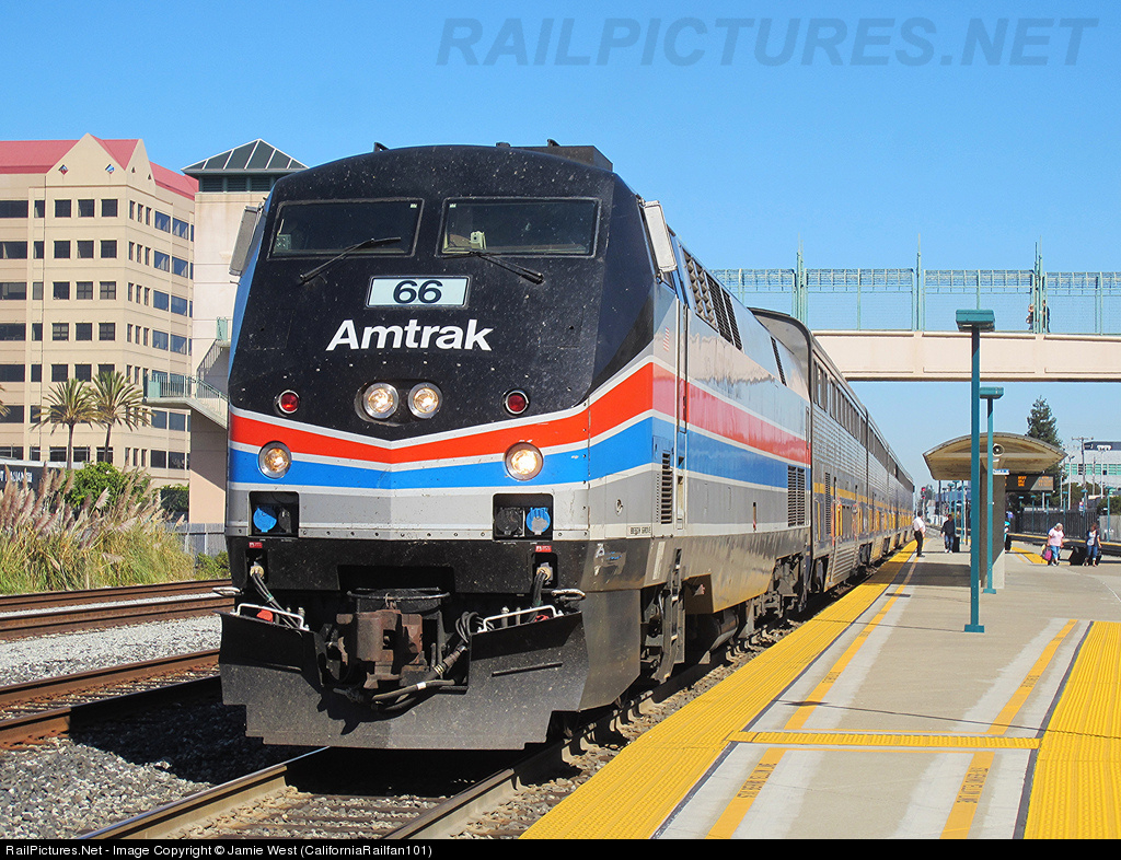 | Amtrak's 40th Anniversary "Phase II" GE P42DC, AMTK 66, sits idling at the Emeryville Amtrak station on the point of Capital Corridor train #729. |