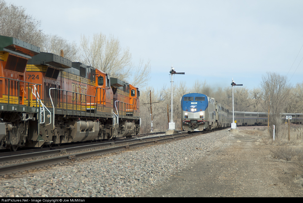 The westbound SOUTHWEST CHIEF meets an eastbound freight at Watrous, New Mexico, March 6, 2005. Watrous siding is located just east of Las Vegas, New Mexico, on the La Junta, Colorado, to Albuquerque line, and is about the only siding on the line still fully protected by semaphores.
