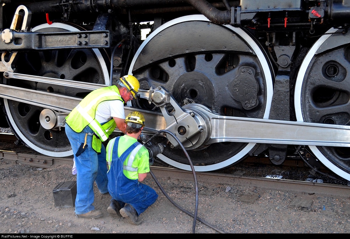 Two crew from UP 844 grease the huge drive wheels prior to heading back to the Cheyenne, Wyoming for Frontier Days