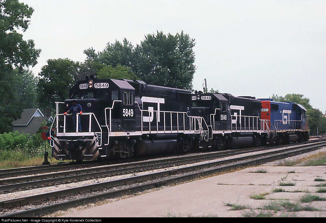 In the early 1980's, the Grand Trunk Western was looking to add to their roster as traffic and profits rose. In addition to acquiring a large number of Ex-UP SD40-2's, they also acquired a small amount of GP38-2's from P&LE. P&LE acquired these from Rock Island and painted a few black, and when GTW received them, they were quickly painted with the GT logo, but kept black to help place power into service quicker. Here, a pair of the former P&LE geeps and an SD40 enter the yard in Durand to pick up cars for their westbound train. 35mm slide from my collection, photo by W.E. Grove.