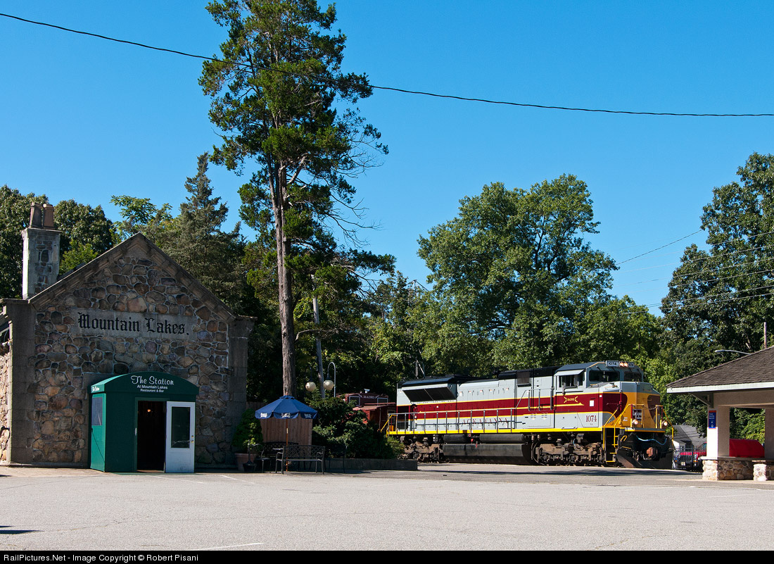 Lackawanna heritage on the Boonton Line... The NS Dover-based H02 local is appropriately led by the Lackawanna heritage unit on a beautiful late-summer day. The local is seen passing the historic Mountain Lakes station, built by the Lackawanna in 1912 (and now occupied by a restaurant). NS 1074 is in transit to the United Railroad Historical Society's Transportation Heritage Festival in Boonton, NJ on the coming weekend, providing a rare opportunity to catch this unit on "home" rails. Special thanks go to the Station at Mountain Lakes Restaurant whose employees cooperated with an impromptu gathering of railfans to move vehicles and other obstructions, making this shot possible.
