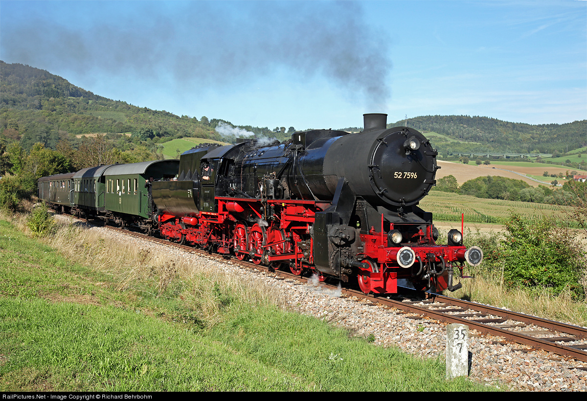 | 52 7596, a Kriegslok 2-10-0 BR 52 of association Eisenbahnfreunde Zollernbahn (EFZ), is pulling the afternoon train on the Sauschwänzlebahn. On the right there is the Biesenbachviaduct. |