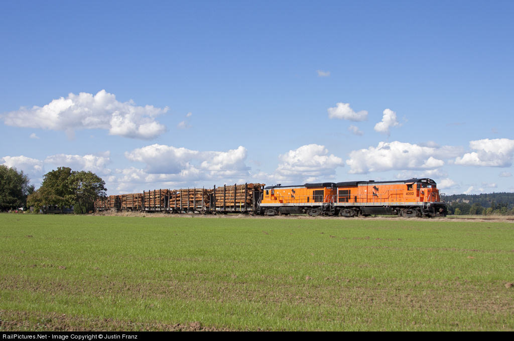Two Albany and Eastern B23-7s lead a short log train under deep blue skies on Sept. 18, 2013 through the scenic Willamette Valley of western Oregon. The A&E is made up of former Southern Pacific and Burlington Northern branch lines and is based in Lebanon. On this day, the railroads two B23-7s did some switching in Lebanon before heading up the old Mill City Branch with some empty log cars for Crabtree. After a few hours, the train returned to town with a cut of loaded log cars. With orange GEs and fresh cut logs, it was hard not to think of the old Maine Central back home in New England.